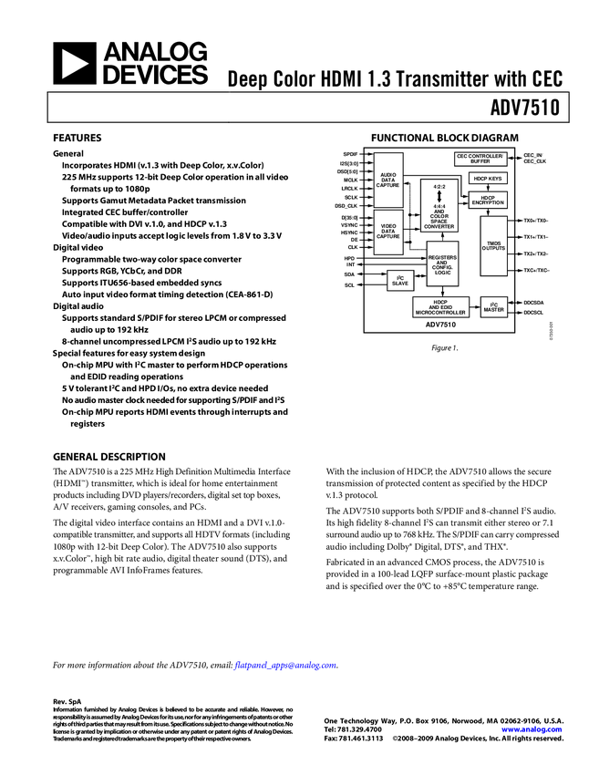 ADV7510 Deep Color HDMI 1.3 Transmitter with CEC