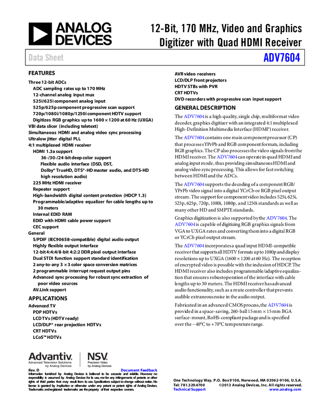 ADV7604 12-Bit, Deep Color HDMI v1.3 Receiver with Analog Interface