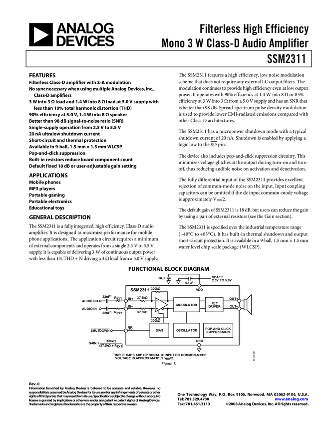 SSM2311 Filterless High Efficiency Mono 3 W Class-D Audio Amplifier