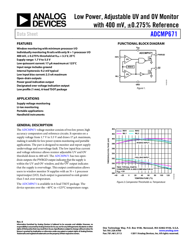 ADCMP671 Low Power Adjustable UV and OV Monitor with 400 mV 0.275% Reference