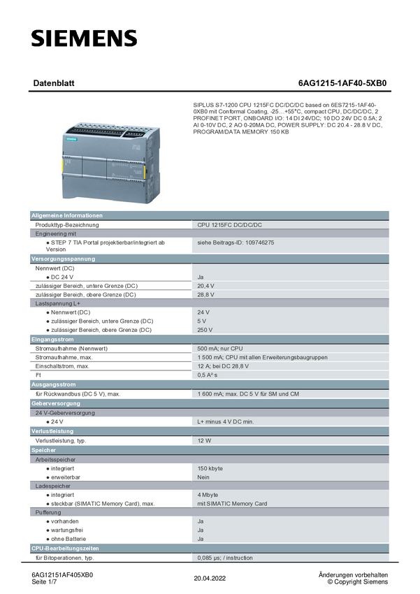 CPU PLC Siemens 6AG1215-1AF40-5XB0 6AG12151AF405XB0