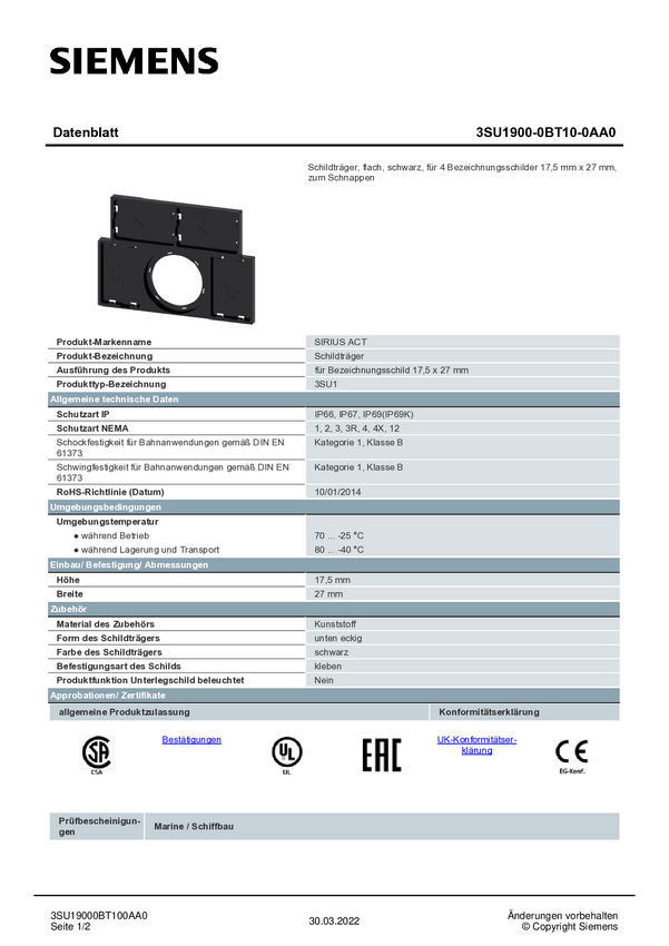3SU19000BT100AA0 Uchwyt tabliczki Siemens 3SU1900-0BT10-0AA0 (S x W) 27 mm x 17.5 mm 10 szt.