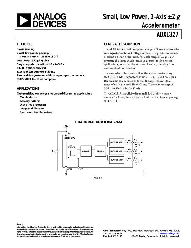 ADXL327 Small, Low Power, 3-Axis ±2 Accelerometer
