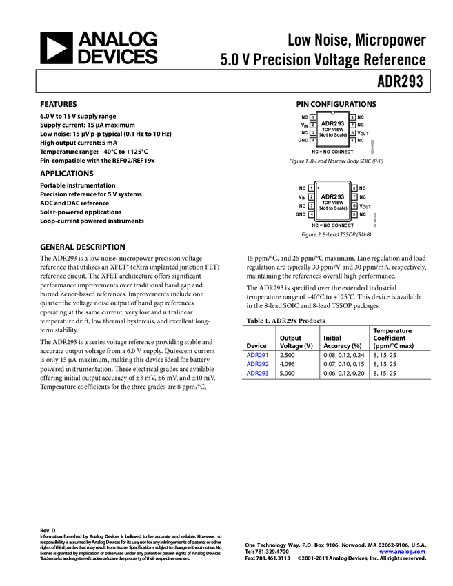 ADR293 Low Noise, Micropower 5.0 V Precision Voltage Reference