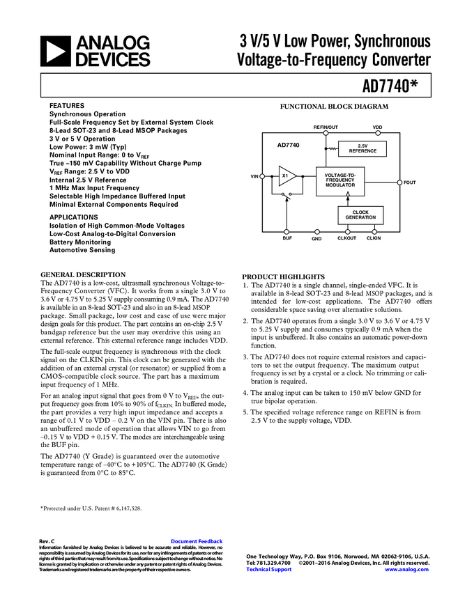 AD7740 3 V/5 V Low Power, Synchronous Voltage-to-Frequency Converter