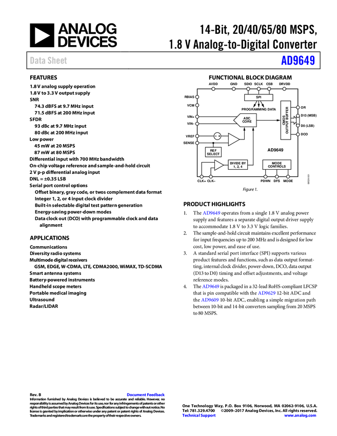 AD9649 14-Bit, 20/40/65/80 MSPS, 1.8 V Analog-to-Digital Converter