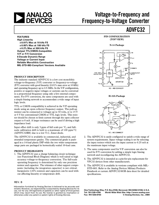 ADVFC32 Low Cost Monolithic Voltage-to-Frequency (V/F) Converter