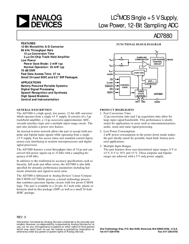 AD7880 CMOS, Single +5 V Supply, Low Power, 12-Bit Sampling ADC