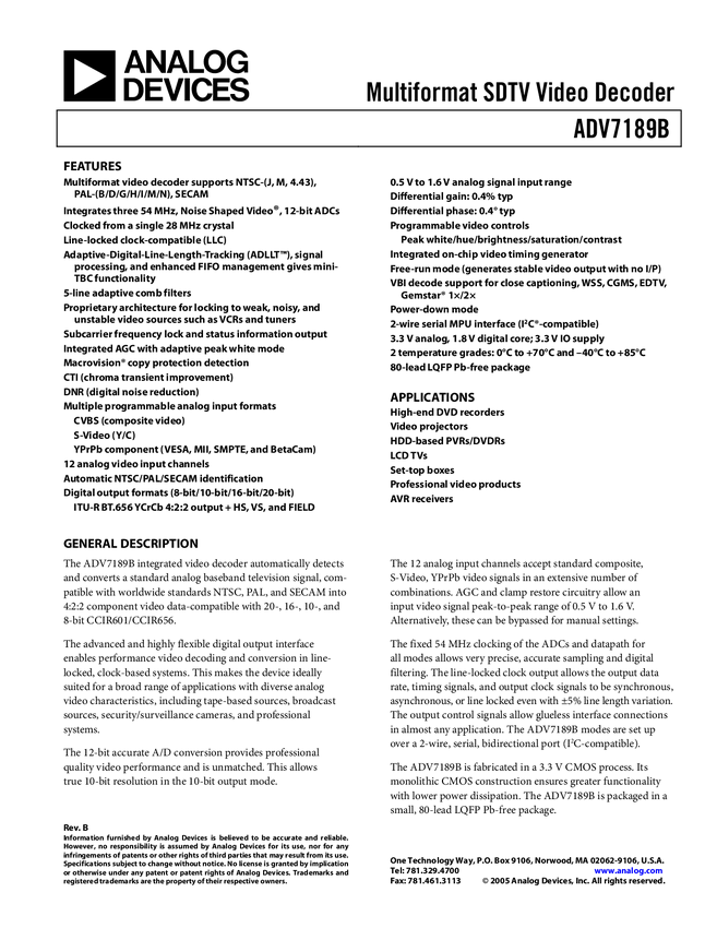 ADV7189B High Performance 12-bit Video Decoder with Noise Shaped Video ADCs