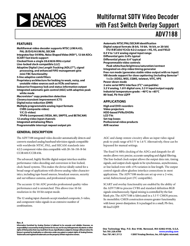 ADV7188 Multiformat SDTV Video Decoder with Fast Switch Overlay Support