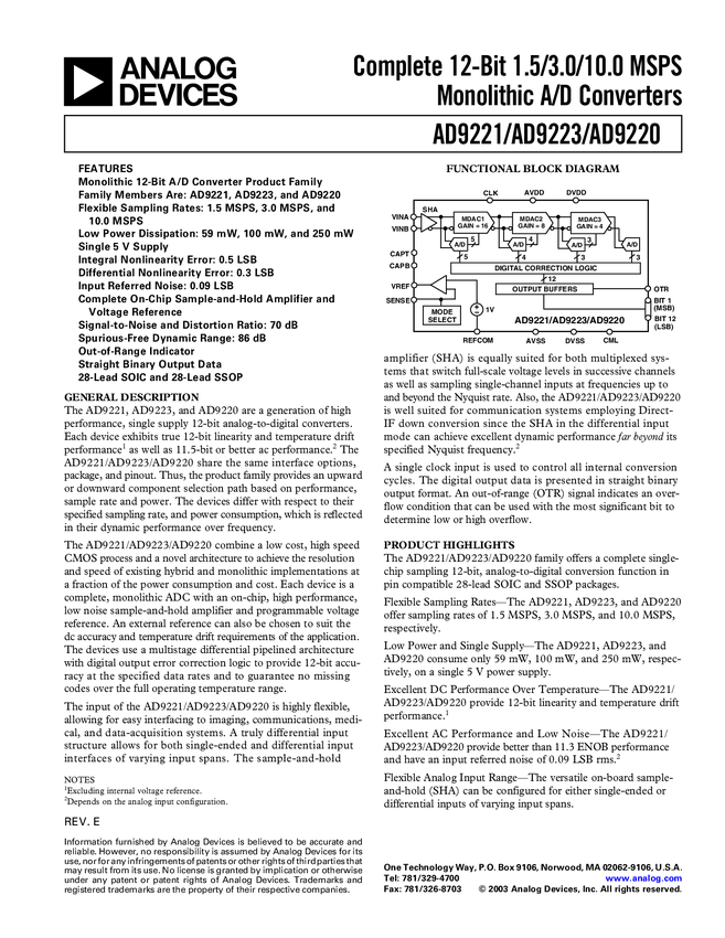 AD9223 12-Bit, 3.0 MSPS A/D Converter