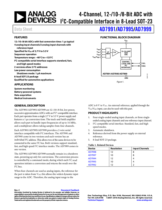 AD7991 4-Channel, 12-Bit ADC with IC Compatible Interface in 8-Lead SOT-23