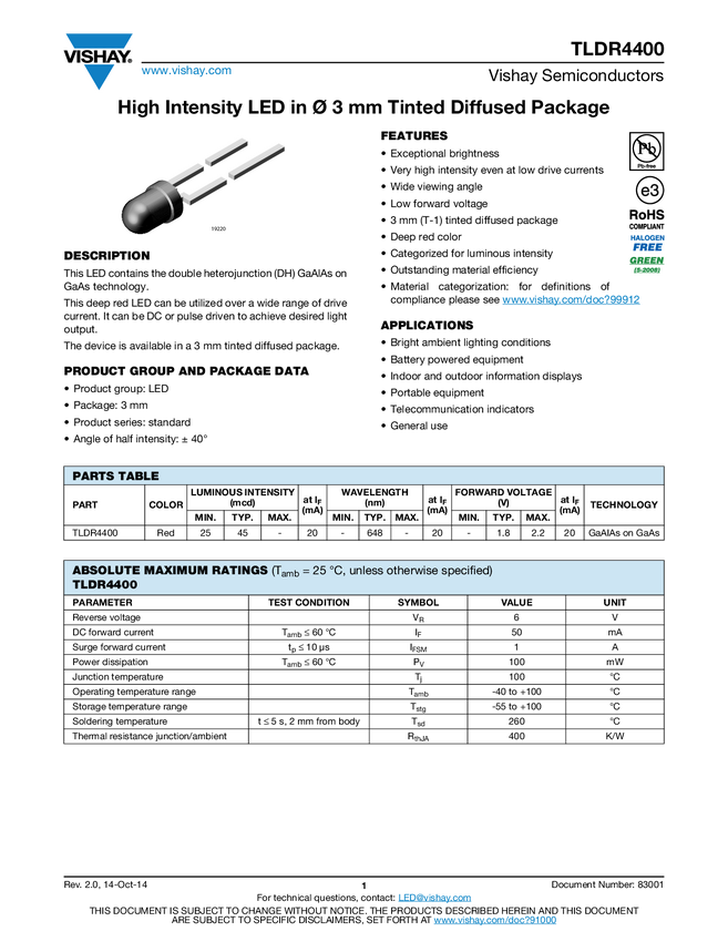 TLDR4400 High Intensity LED in Ø 3 mm Tinted Diffused Package