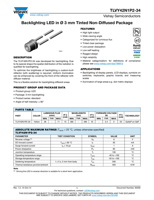TLVY42N1P2-34 Backlighting LED in Ø 3 mm Tinted Non-Diffused Package