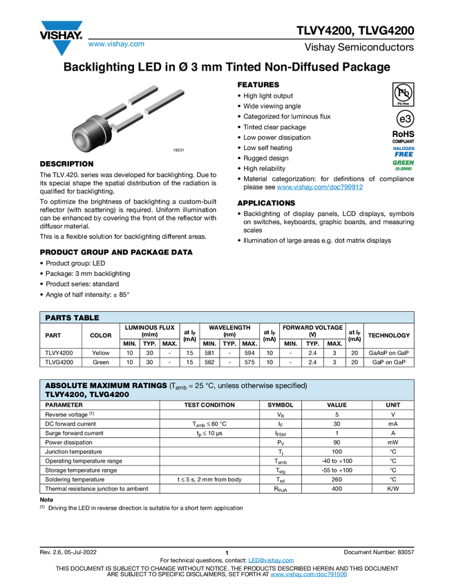 TLVY4200 Backlighting LED in Ø 3 mm Tinted Non-Diffused Package