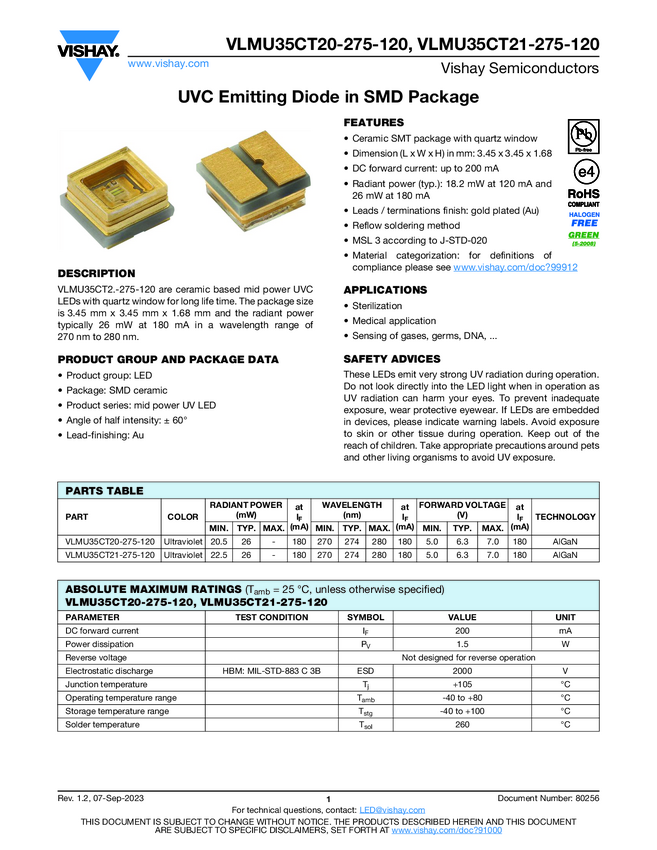 VLMU35CT20-275-120 UVC Emitting Diode in SMD Package