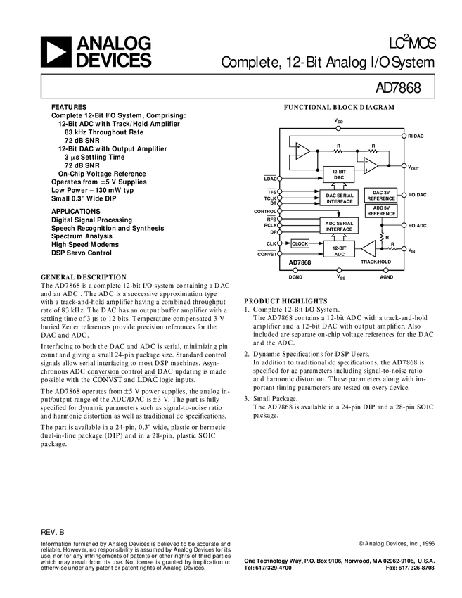 AD7868 CMOS, Complete 12-Bit Analog I/O System