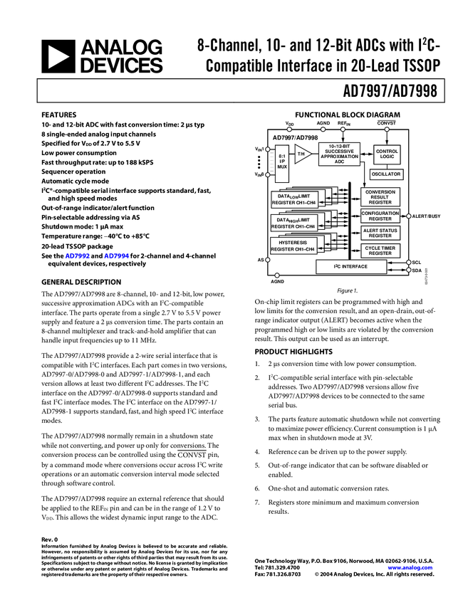 AD7998 8-Channel, 12-Bit ADC with IC Compatible Interface in 20-Lead TSSOP