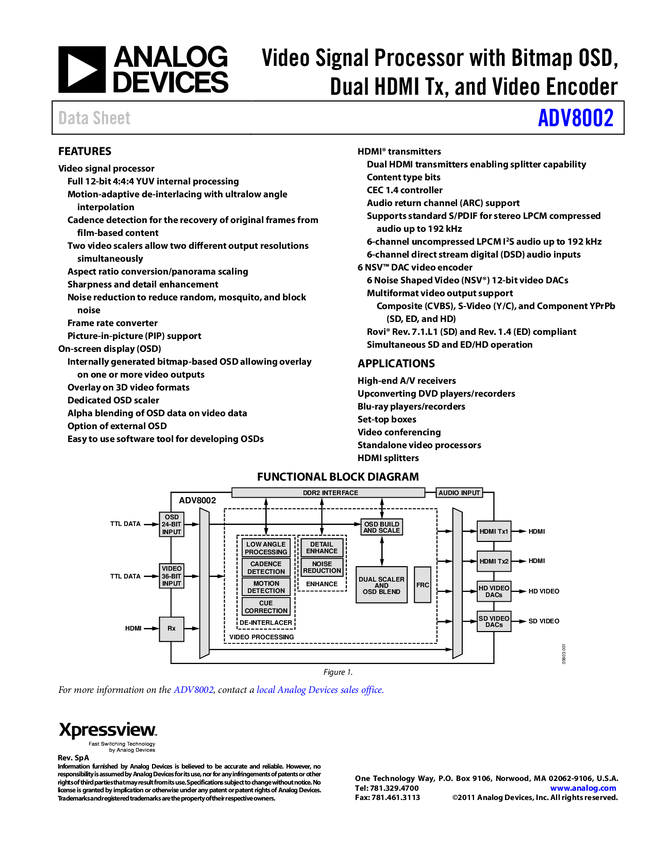 ADV8002 Video Signal Processor with Bitmap OSD, Dual HDMI T and Video Encoder