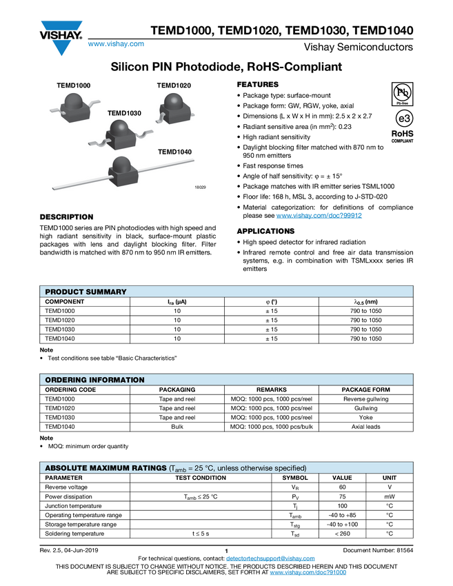 TEMD1030 Silicon PIN Photodiode, RoHS-Compliant