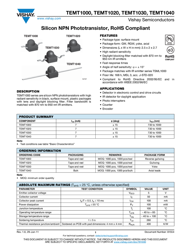 TEMT1020 Silicon NPN Phototransistor, RoHS-Compliant
