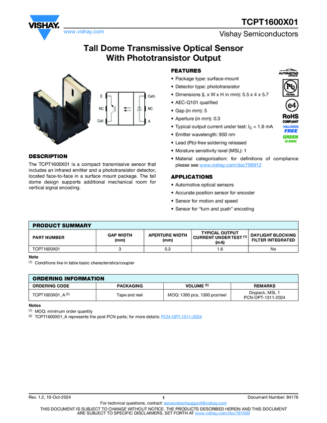 TCPT1600X01 Tall Dome Transmissive Optical Sensor With Phototransistor Output