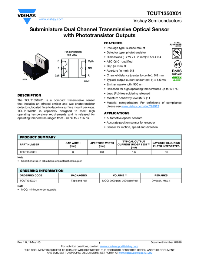 TCUT1350X01 Subminiature Dual Channel Transmissive Optical Sensor with Phototransistor...