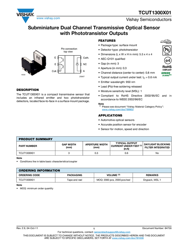 TCUT1300X01 Subminiature Dual Channel Transmissive Optical Sensor with Phototransistor...