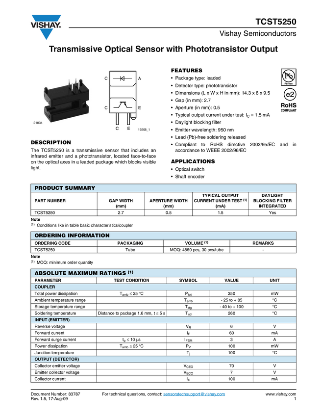 TCST5250 Transmissive Optical Sensor With Phototransistor Output
