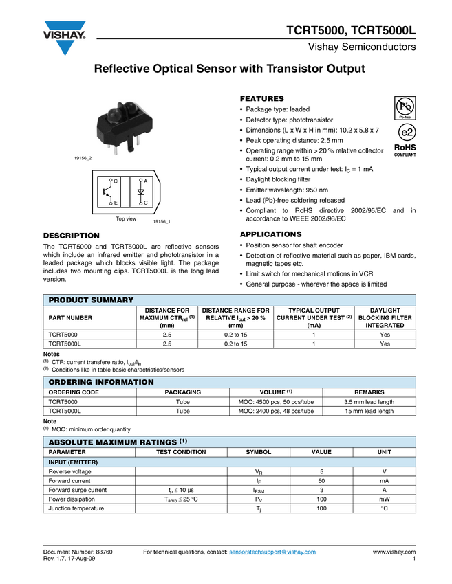 TCRT5000 Reflective Optical Sensor With Transistor Output