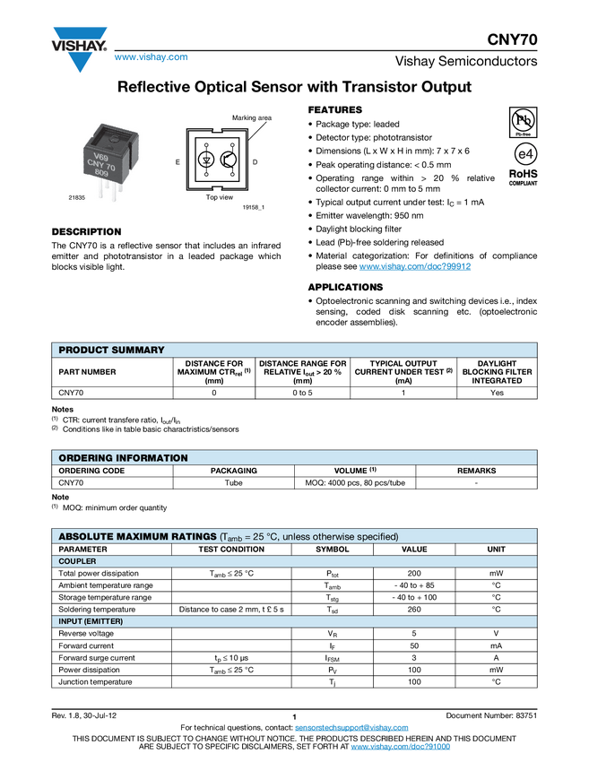 CNY70 Reflective Optical Sensor With Transistor Output