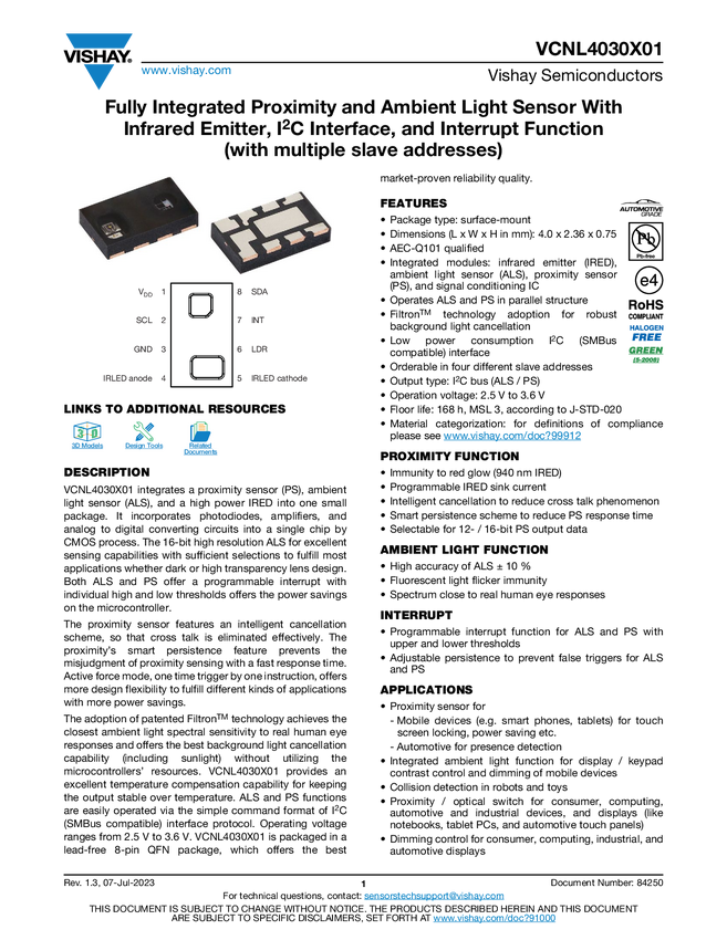 VCNL4030X01 Fully Integrated Proximity and Ambient Light Sensor With Infrared Emitter,...