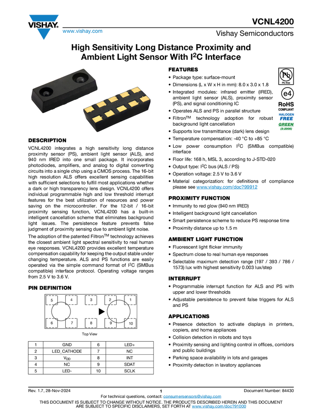 VCNL4200 High Sensitivity Long Distance Proximity and Ambient Light Sensor With I2C...