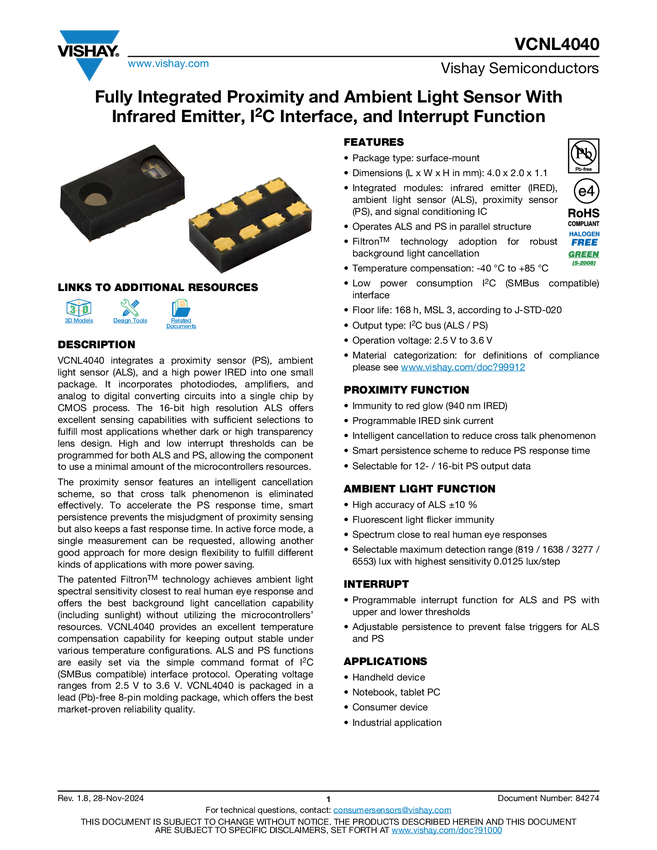 VCNL4040 Fully Integrated Proximity and Ambient Light Sensor With Infrared Emitter,...