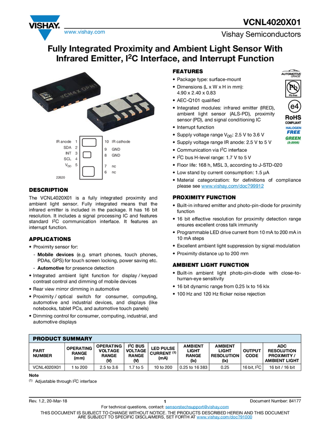 VCNL4020X01 Fully Integrated Proximity and Ambient Light Sensor With Infrared Emitter,...