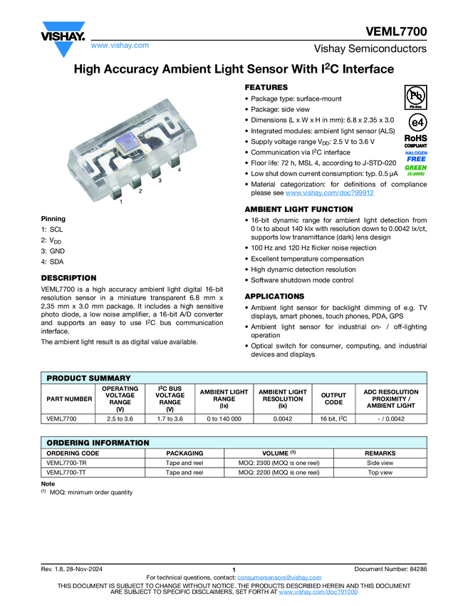 VEML7700 High Accuracy Ambient Light Sensor With I2C Interface