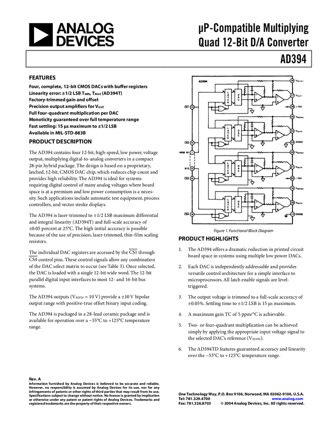 AD394 µP Compatible Multiplying Quad 12-Bit D/A Converter