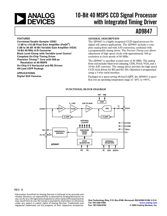 AD9847 10-Bit 40 MSPS CCD Signal Processor with Integrated Timing Driver