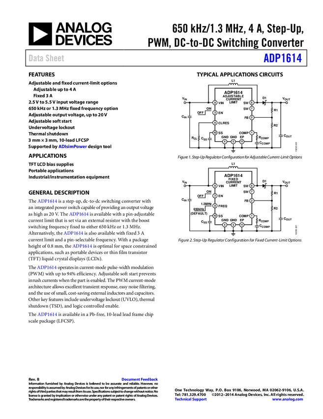 ADP1614 650kHz/1.3 MHz, 4 A, Step-Up,PWM, DC-to-DC Switching Converter