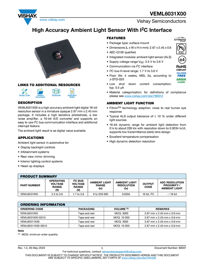 VEML6031X00 High Accuracy Ambient Light Sensor With I²C Interface