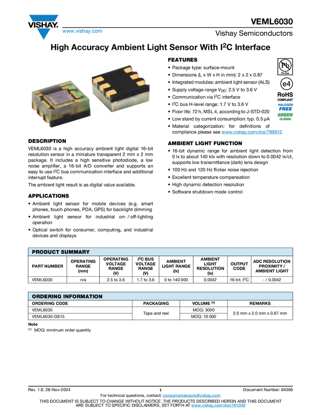 VEML6030 High Accuracy Ambient Light Sensor With I2C Interface