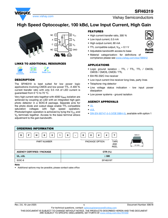 SFH6319 High Speed Optocoupler, 100 kBd, Low Input Current, High Gain