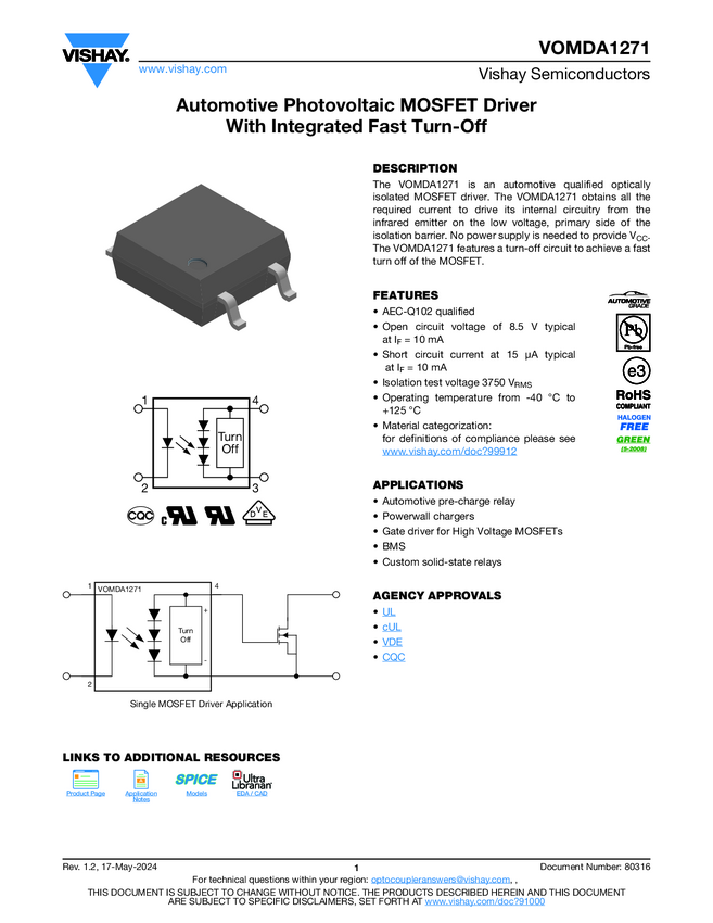 VOMDA1271 Automotive Photovoltaic MOSFET Driver With Integrated Fast Turn-Off