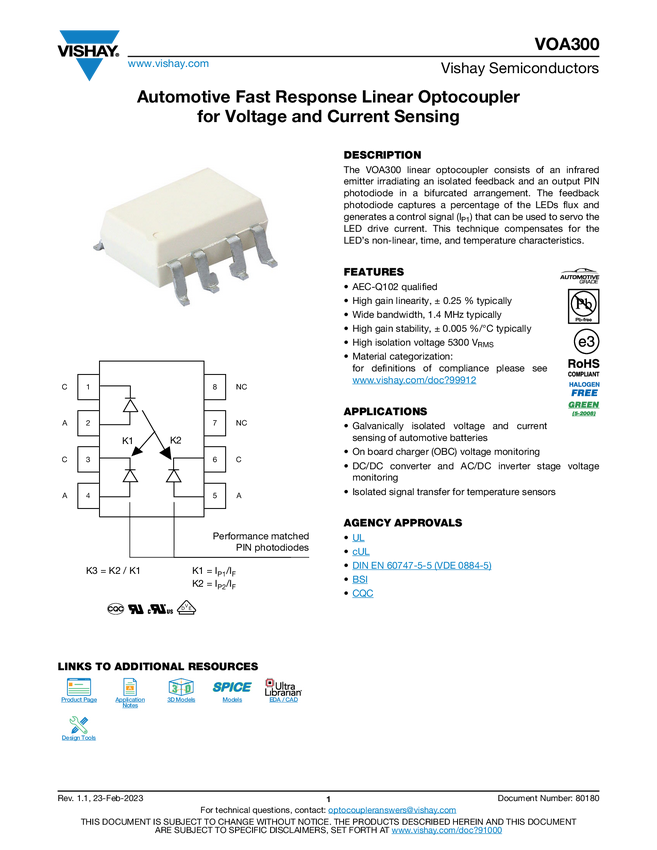 VOA300 Automotive Fast Response Linear Optocoupler for Voltage and Current Sensing