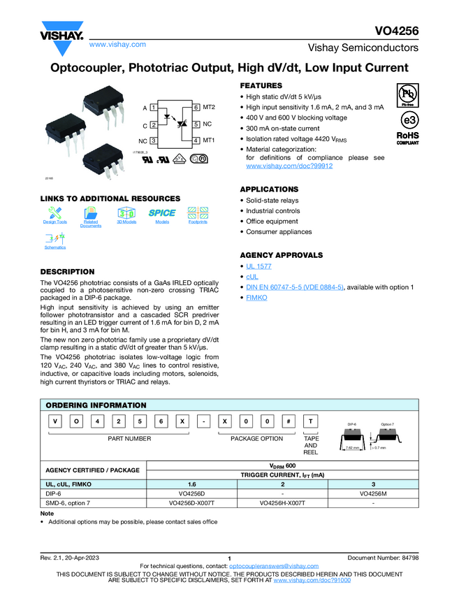 VO4256 Optocoupler, Phototriac Output, High dV/dt, Low Input Current