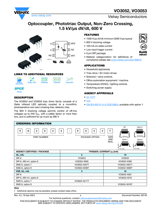 VO3053 Optocoupler, Phototriac Output, Non-Zero Crossing, 1.5 kV/µs dV/dt, 60...