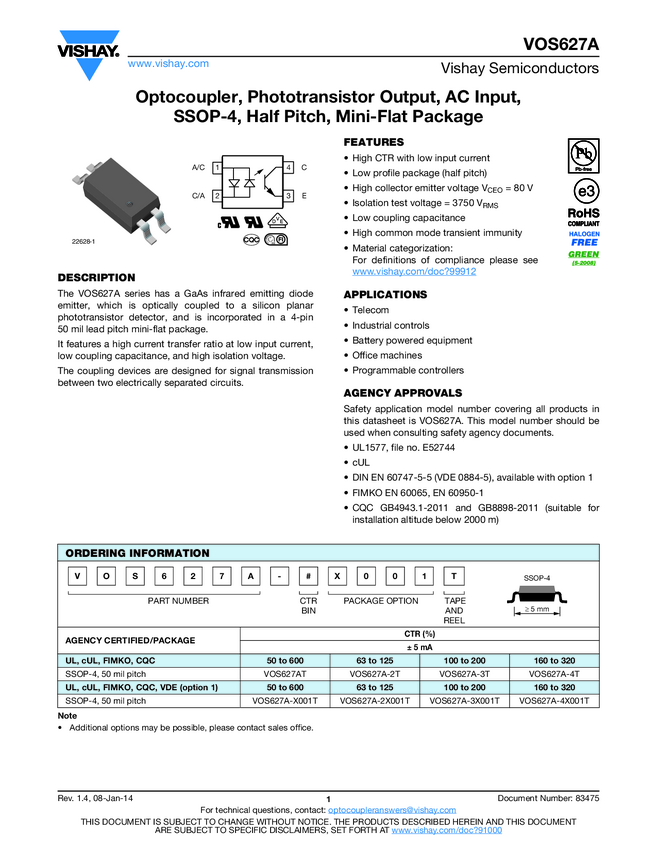 VOS627A Optocoupler, Phototransistor Output, AC Input, SSOP-4, Half Pitch, Mini-Fla...