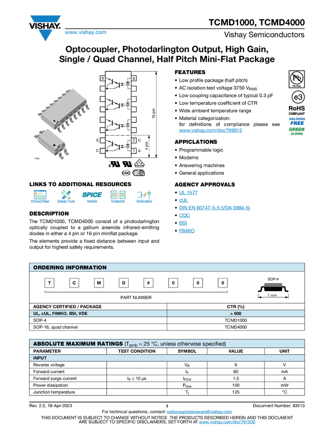 TCMD1000 Optocoupler, Photodarlington Output, High Gain, Single / Quad Channel, Half...