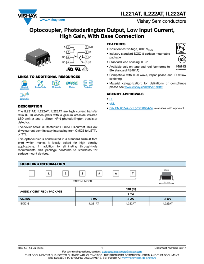 IL222AT Optocoupler, Photodarlington Output, Low Input Current, High Gain, With Bas...