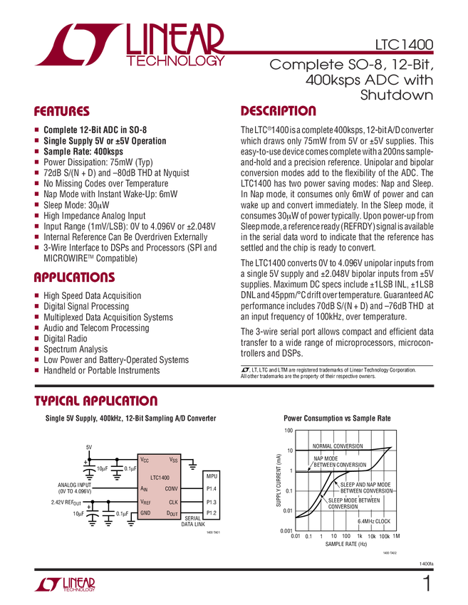 LTC1400 Complete SO-8, 12-Bit, 400ksps ADC with Shutdown